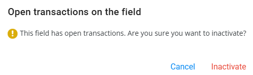 Note: If the Field has any open transactions (uninvoiced Blend or Delivery Tickets) a message will display to indicate there are open transactions and provide the option to Inactivate the Field or Cancel.
