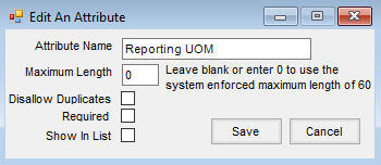 - To establish the Reporting UOM Attribute, go to Hub / Setup / Company Preferences / Product and select Product Attributes. Add a new Attribute like the one below and Save.