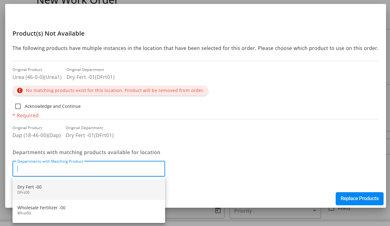 - In this scenario, there are Products with no match and multiple matches. Products with an exact match will be added to the Work Order automatically and will not be included on the dialog. The Acknowledge and Continue checkbox must be selected before selecting Replace Products and will remove that Product from the order.