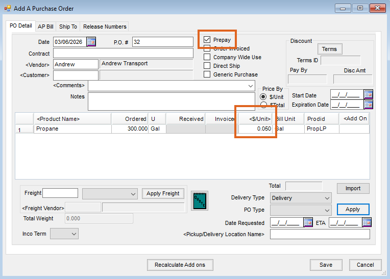 - The Purchase Order now displays the amount booked. Selecting Apply calculates the amount of Prepay.