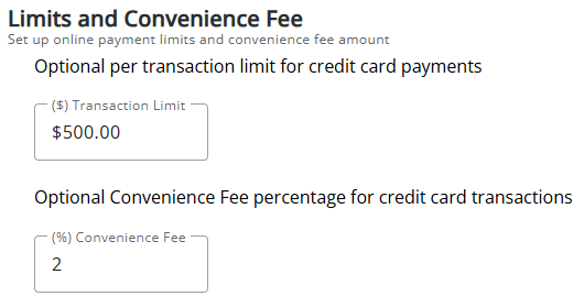 Enter a convenience fee percentage for transactions in the (%) Convenience Fee field. This is an optional setting that will automatically apply the specified amount to all credit card transactions. The amount entered here must follow individual state guidelines for applying convenience fees to payments and cannot exceed 4%. If not using convenience fees, enter 0.